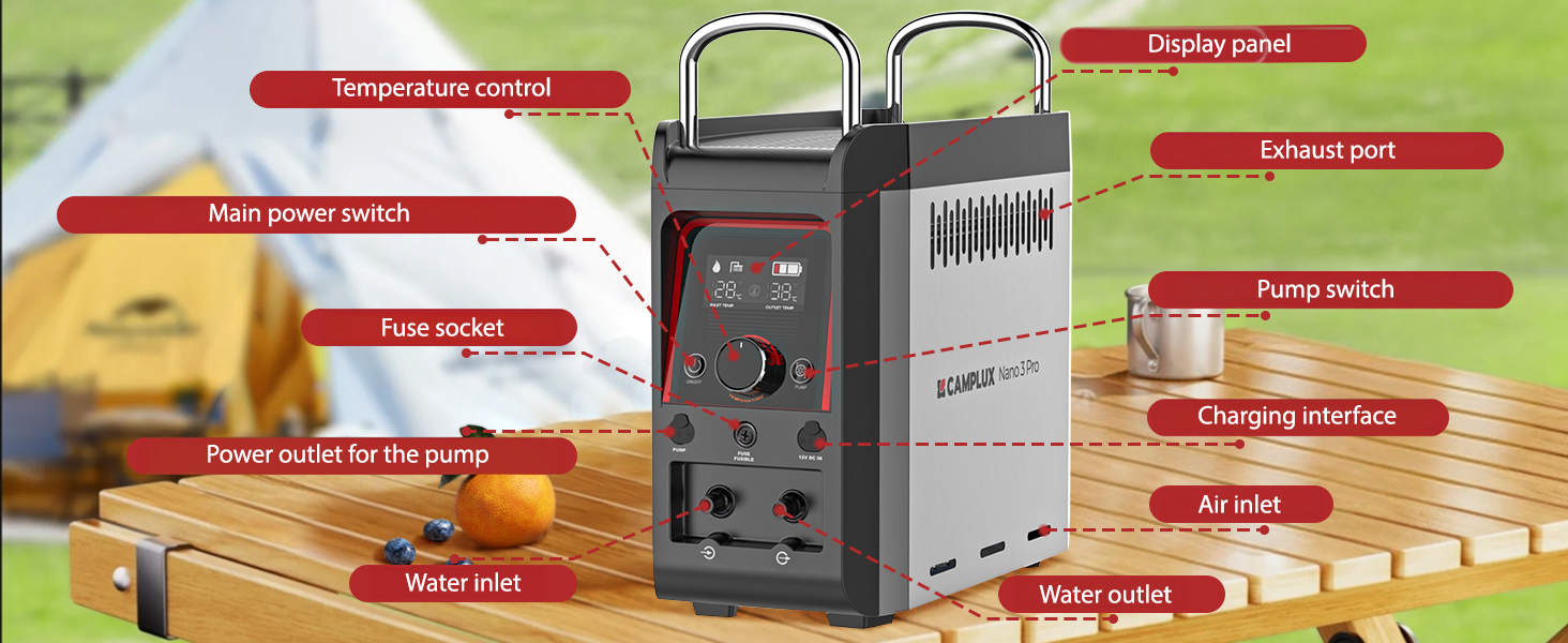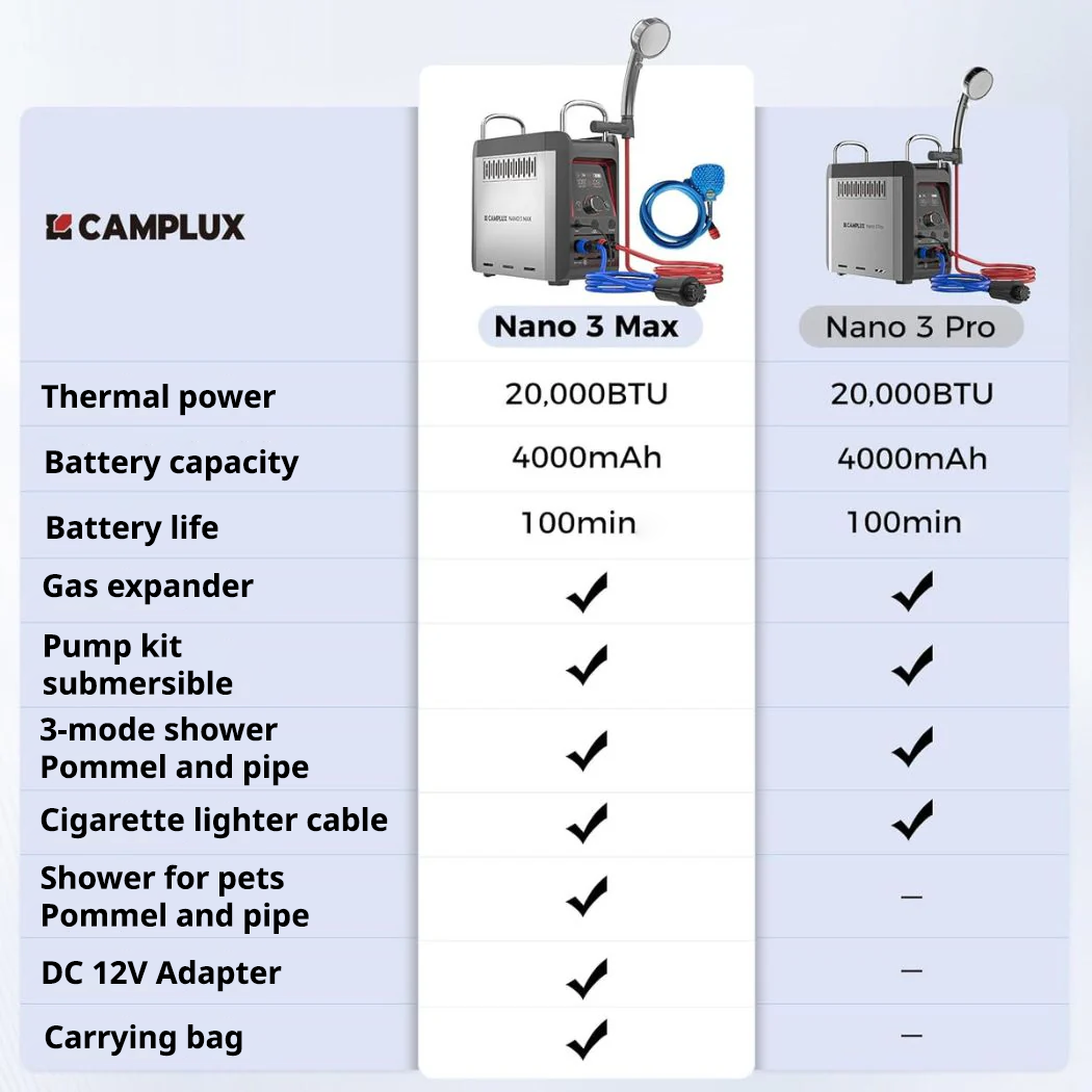 The Camplux Nano 3 Pro portable gas shower heats water using a propane or butane gas burner. Water is drawn from a tank via an integrated pump; the burner ignites automatically when the water circulates and heats it instantly.