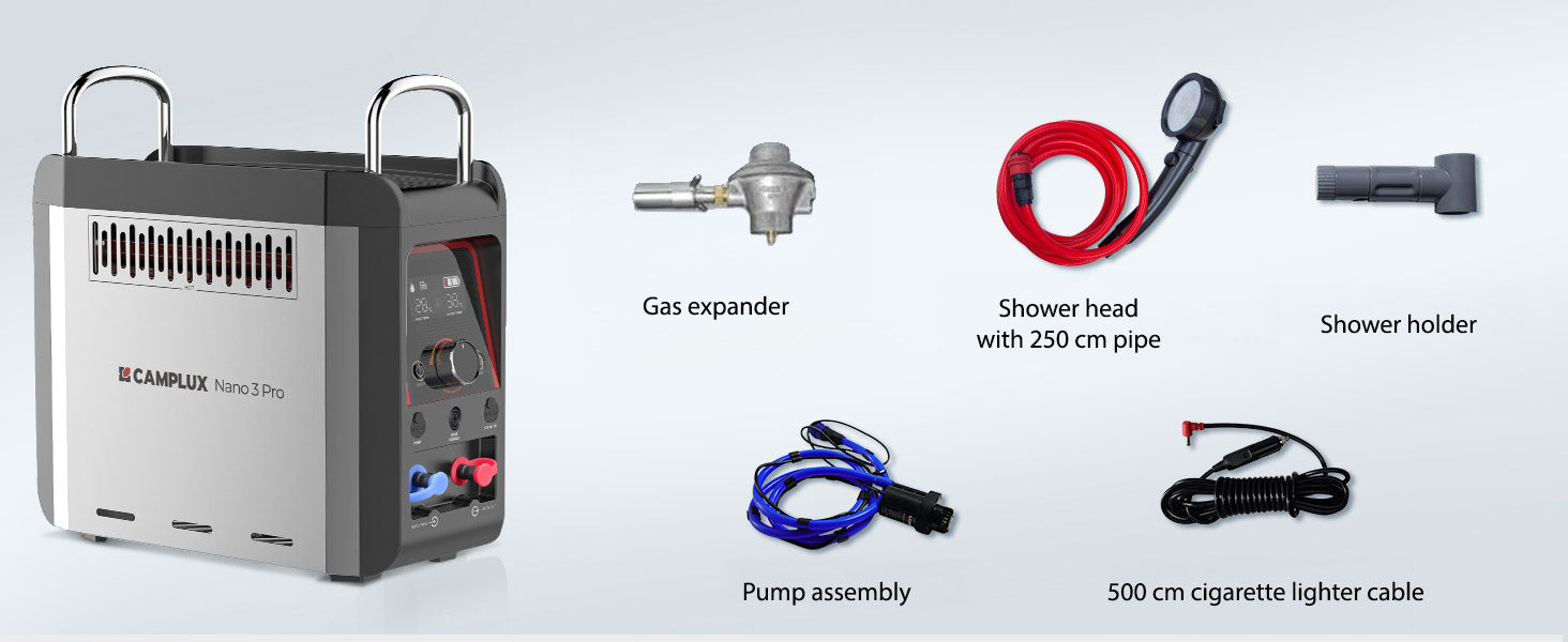 The Nano 3 Max gas water heater comes with several practical accessories to facilitate its use and transport: a Camplux carrying bag, a pet shower head, and a 220/12V adapter.