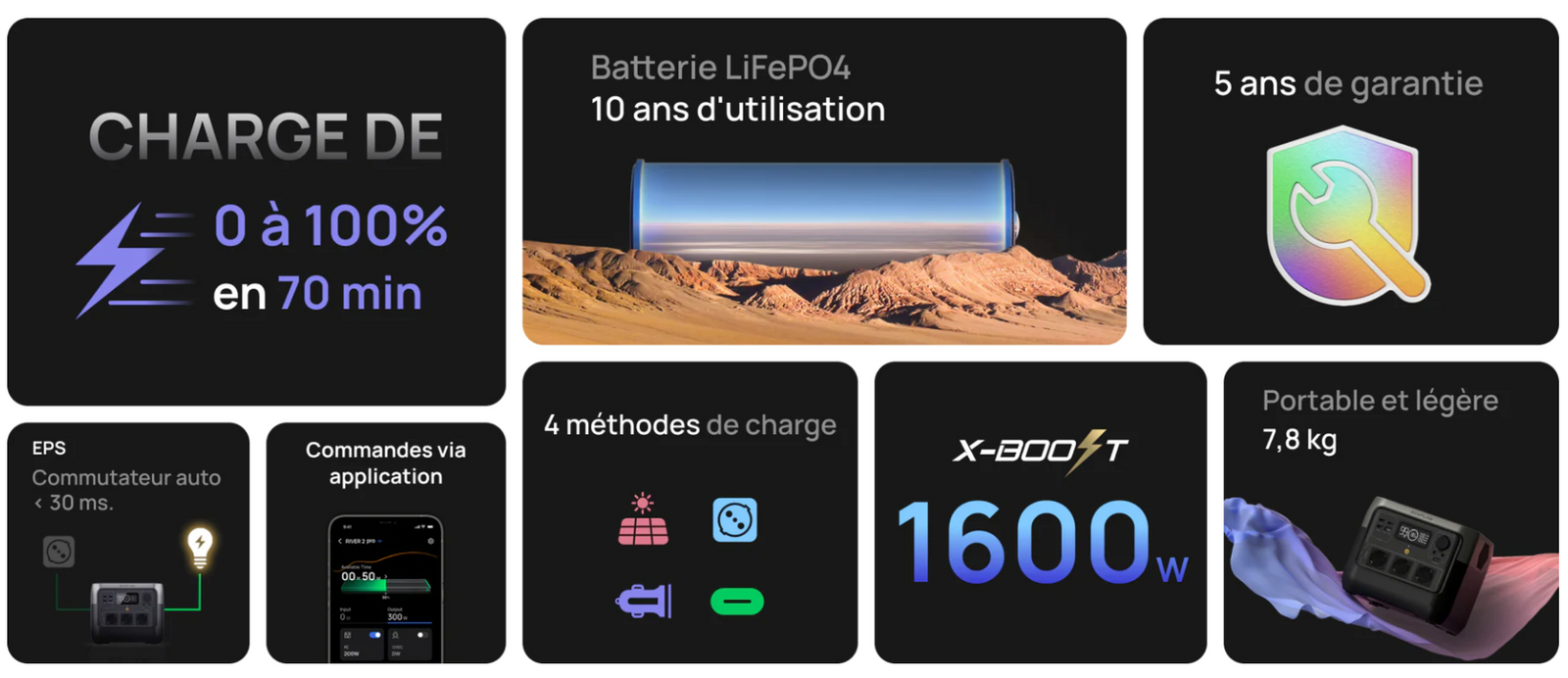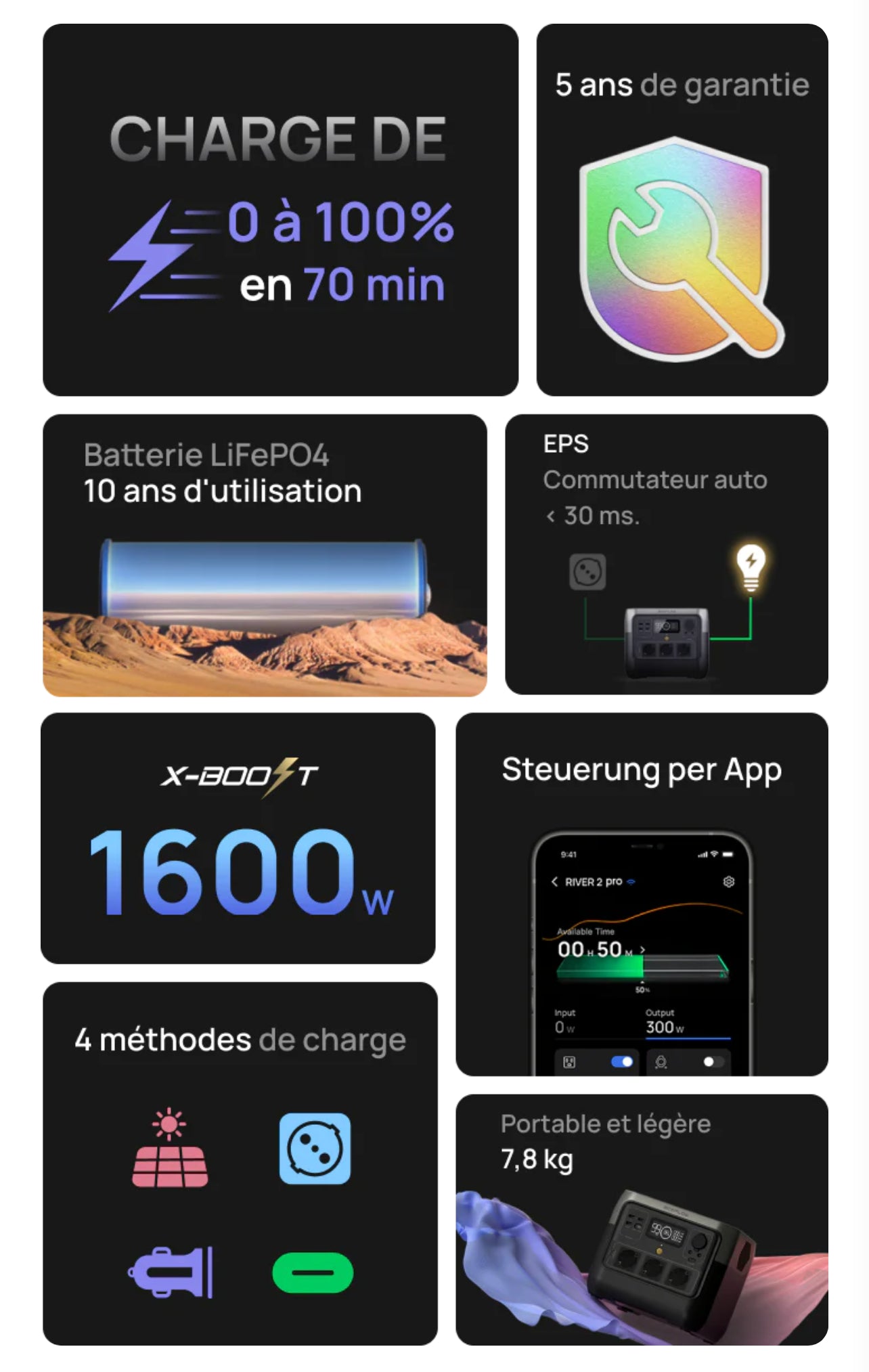 La RIVER 2 Pro surpasse la référence de l'industrie en matière de vitesses de charge, avec une charge complète en seulement 70 minutes. Elle est 5 fois plus rapide que les autres stations électriques portables du marché et 27 % plus rapide que les générations précédentes.